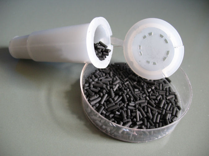 Der Stopfen kann mit dem Schnappdeckel immer wieder mit ca. 3 g Aktivkohle gefüllt werden. Die Aktivkohle adsorbiert ca. 30% ihres Gewichts, d.h. ca. 0,6-0,9 g Schadstoff pro Stopfenfüllung. Die Kohle wird erneuert, wenn das Gewicht des Stopfens um ca. 0,6 g zugenommen hat oder wenn erste Geruchsbelästigungen auftreten. Die gebrauchte Aktivkohle sollte gesammelt und von Zeit zu Zeit durch Erhitzen unter dem Abzug regeneriert werden. Die endgültige Entsorgung kann durch Verbrennen im Abzug erfolgen, ist aber aufgrund der geringen Mengen an adsorbierten Stoffen auch über den Hausmüll möglich.