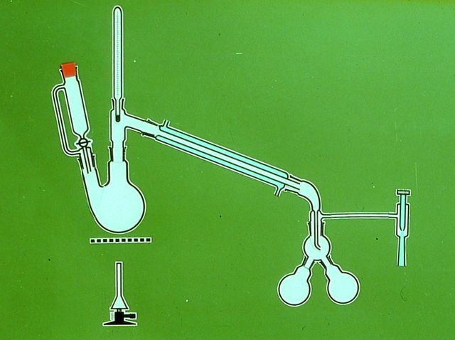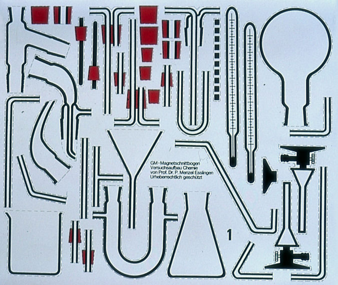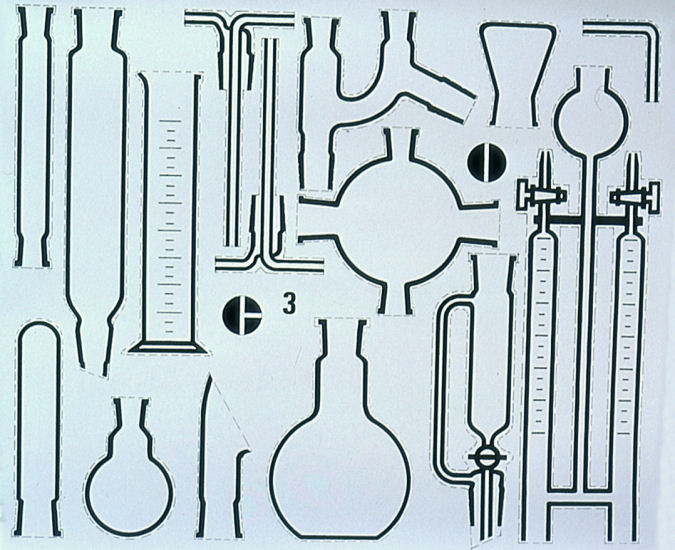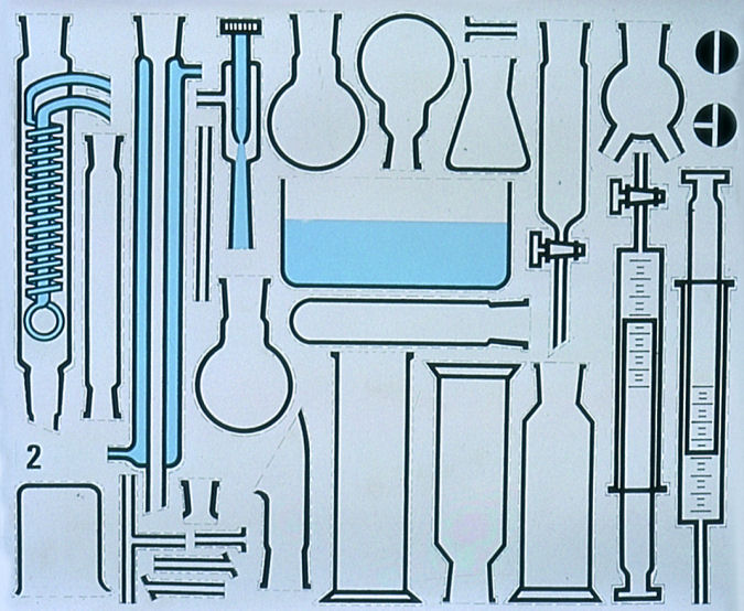 | Bestandteile: | - Bogen 1 - 3, alle Teile ausgeschnitten - neben den üblichen Glasgeräten auch Rückflusskühler, Kolonne, Tropftrichter, Kolbenprober, Hoffmanscher Zersetzungsapparat, Reaktionskugel, U-Rohr, Elektroden, Wasserstrahlpumpe - auf 4 Aufbewahrungsblechen